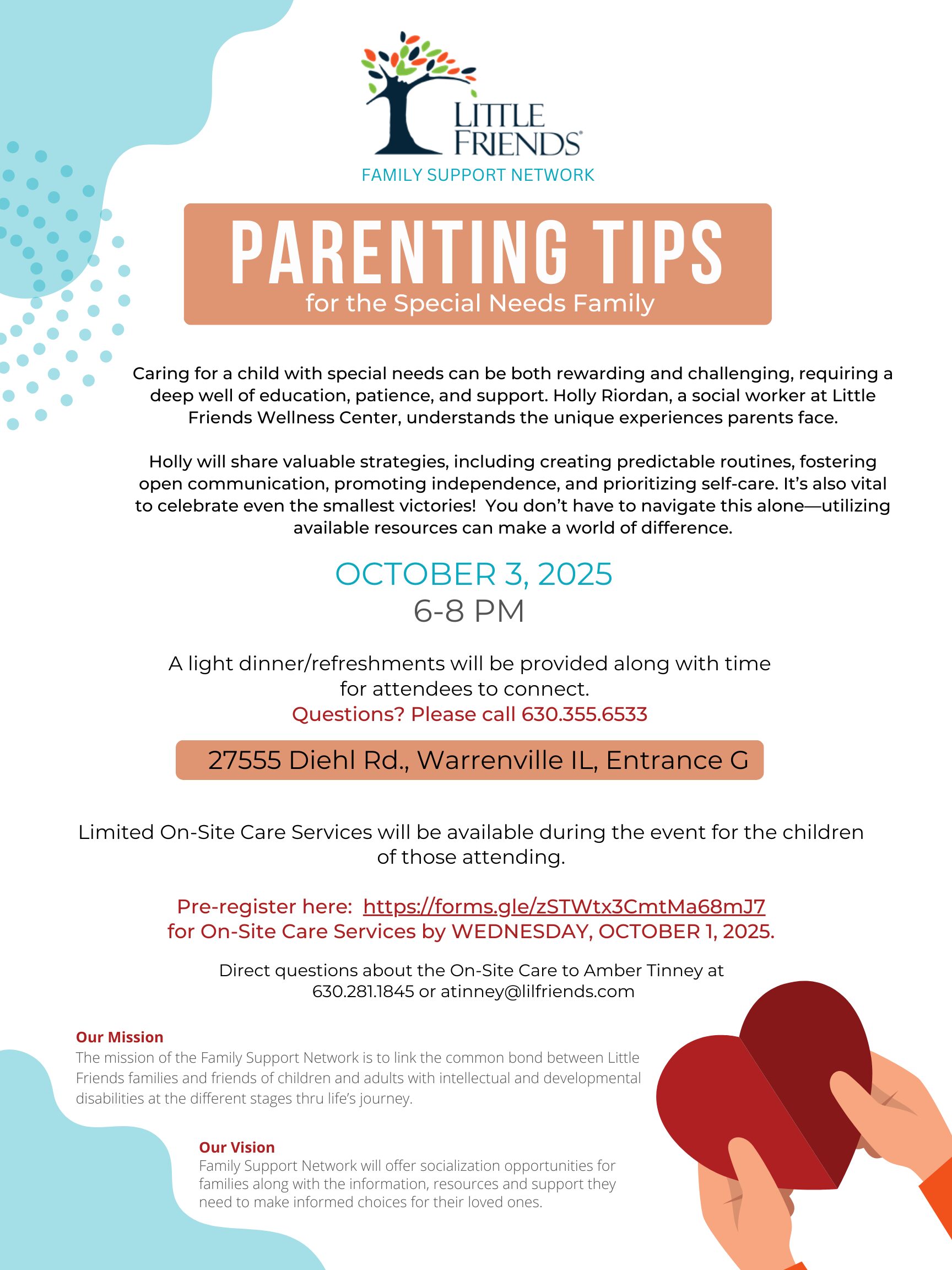 Little Friends Family Support Network offers socialization opportunities for families along with the information, resources, and support they need to make informed choices for their loved ones. This group meets quarterly at our Warrenville campus.
